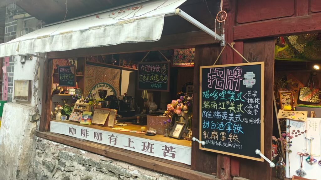 大理古城商业化非常浓厚,总结下来,全部是卖东西的。主要有卖咖啡的、卖扎染的、卖果酒的、卖编织包的、菌子火锅、饵块等等。